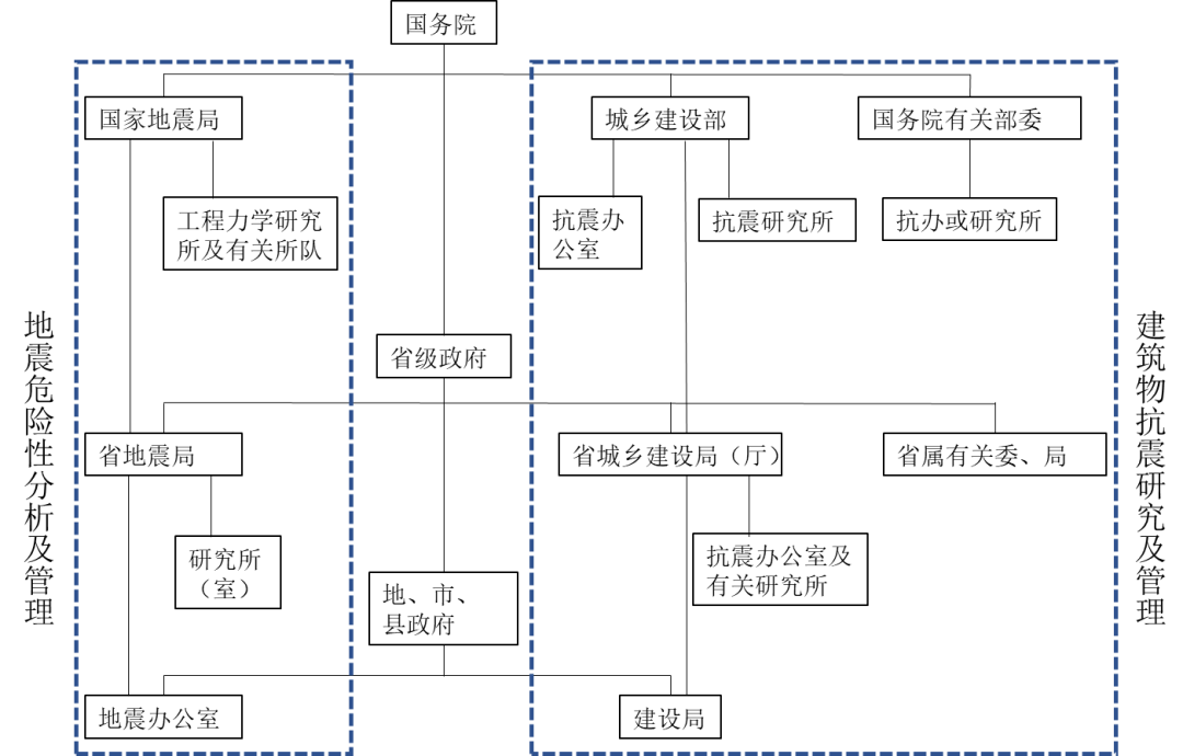 (7)?到了1980年代末,我國地震工作系統主要由國家、?。ㄖ陛犑小⒆灾螀^)、地(市)、縣等各級地震局構成,抗震工作系統主要由建設部、?。ㄖ陛犑?、自治區)、地(市)、縣等各級建設行政主管部門的抗震辦公室構成,二者的行政職責與分工是明確的,有機地組成了我國抗震防災組織系統(圖1)。