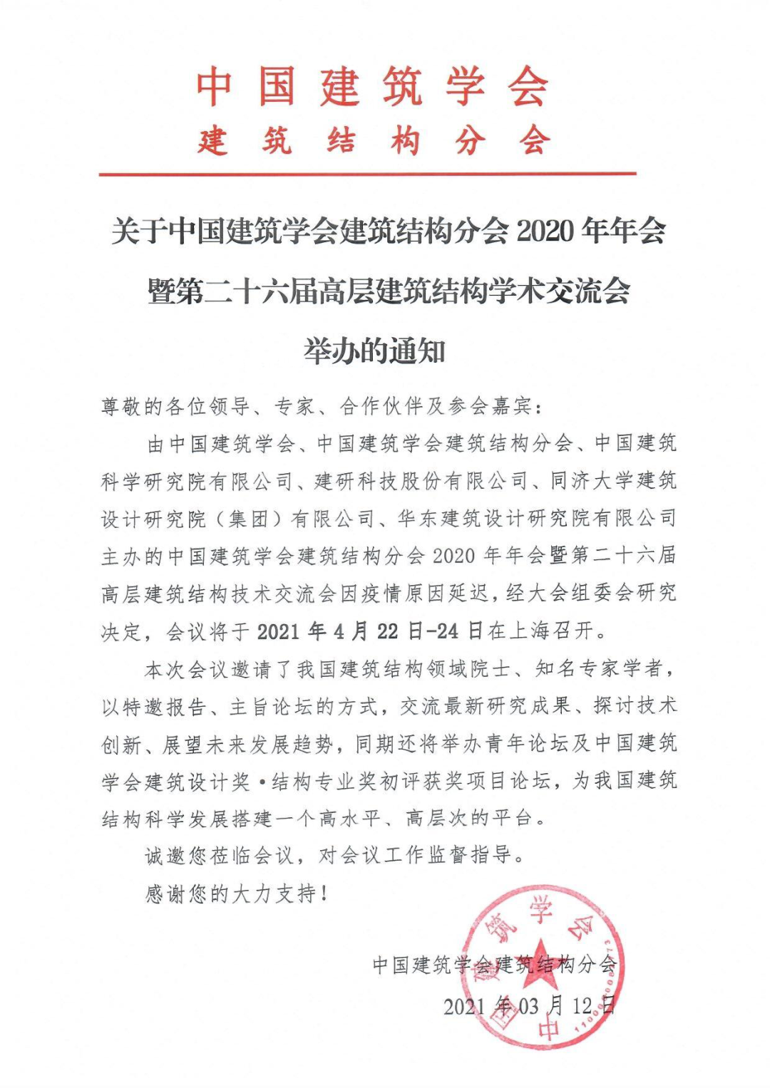 由中國建筑學(xué)會、中國建筑學(xué)會建筑結(jié)構(gòu)分會、中國建筑科學(xué)研究院有限公司、建研科技股份有限公司、同濟(jì)大學(xué)建筑設(shè)計研究院(集團(tuán))有限公司、華東建筑設(shè)計研究院有限公司主辦的中國建筑學(xué)會建筑結(jié)構(gòu)分會2020年年會暨第二十六屆高層建筑結(jié)構(gòu)技術(shù)交流會因疫情原因延遲,經(jīng)大會組委會研究決定,會議將于2021年4月22日-24日在上海召開。