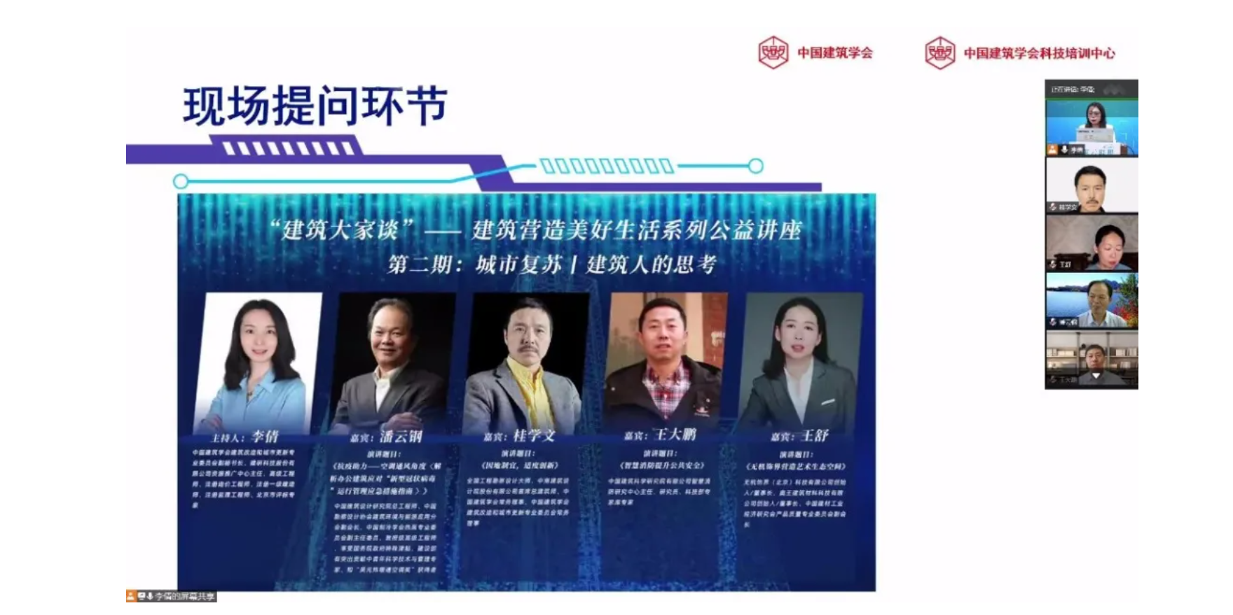 最后嘉賓在線回答了網友的現場提問,他們從各自的角度,從城市的區域到建筑、從建筑的安全到設施設備和材料,對城市的更新與復蘇給出了他們的專業解讀。我們的城市建設已經從增量時代開始轉入存量時代,如何更加高質高效地做好存量時代的轉型,也是面向未來非常有意義的探索。
