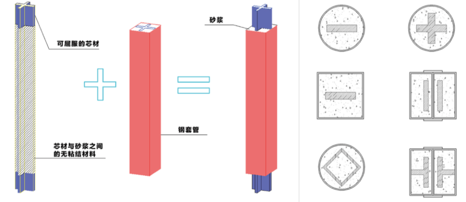 屈曲約束支撐由芯材,無粘結填充材料、約束外套筒組成