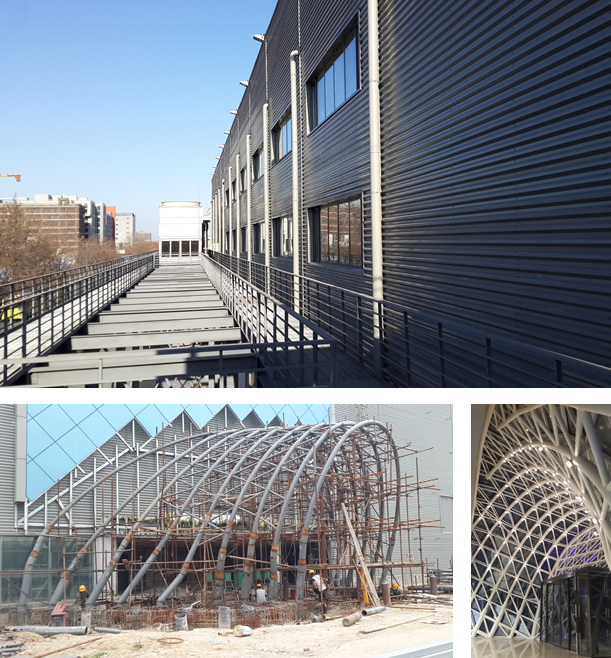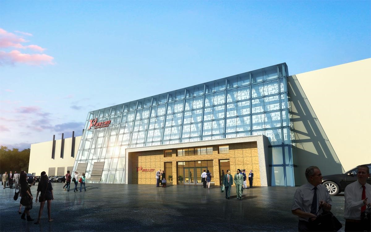 外立面和門頭改造,原外立面裝飾面全部拆除,改造成玻璃幕墻及雙層壓型鋼板復(fù)合保溫板(帶造型);門頭采用為單層網(wǎng)殼曲面造型,外表為隱框玻璃幕墻。